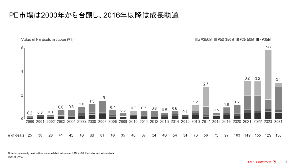 日本のPE市場は2000年代初めに台頭し、2007年まで急速な成長を見せたものの、その後の世界金融危機の影響を受け、案件総額は長期間にわたり低い水準で推移した。2016年以降は大規模案件により市場は大幅に伸長し、直近数年では年間200億ドル超の案件総額を記録している。
