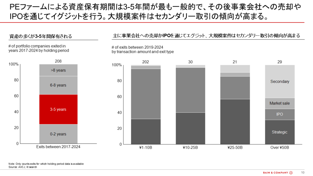 日本で活動するPEファームには、国内ファームと海外ファームの日本拠点の双方が含まれ、後者はより大規模案件に重点を置く傾向がある。PEファームによる買収企業の平均保有期間は4-5年で、近年はセカンダリー取引の比重が高くなっているものの、事業会社への売却またはIPOを通じてイグジットに至るのが一般的である。