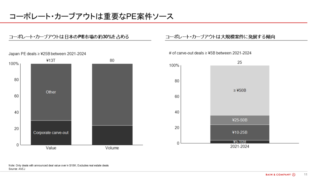 コーポレート・カーブアウト(大企業による事業売却):ROE(自己資本利益率)を重視する日本政府は、ROEの改善はコーポレートガバナンスを強化することで達成できると考えており、これが大企業による事業売却の後押しとなっている。日本企業はグローバル企業と比べると事業が多角・分散傾向にあるため、全ての事業に十分な資金を投じることが困難となっている。その結果、事業によっては、現在の親会社の一部としてではなく、独立した経営体制に移行した方がさらなる発展を実現できる可能性がある。