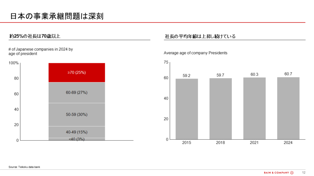 オーナー/創業者による事業承継:もう一つの重要かつ潜在的な案件の源泉である。企業のオーナーや創業者の多くが高齢となり引退年齢に差し掛かっているが、必ずしも適切な後継者がいるとは限らない。そのような場合、PEは経営権をプロフェッショナルな経営陣に移行して事業承継を支援する機会を与えるのみならず、新たな資本を提供することでオーナー/創業者は資産を現金化することが可能となる。多くの企業で社長の高齢化が進んだ結果、70歳以上の社長が25%を超えており、日本には事業継承の大きな機会が存在している。