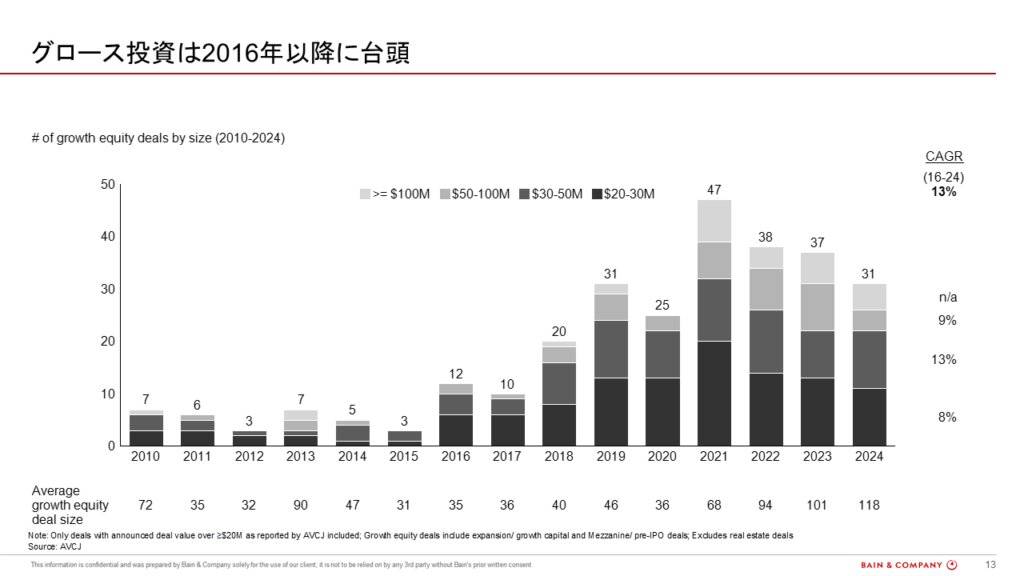グロース投資:通常、後期ステージのスタートアップ企業に対して行われる新規エクイティ投資を指す。従来、スタートアップは比較的早い段階でIPOを目指す傾向があり、IPO時の中央値のバリュエーションは約150億円程度であった。しかし、プライベートなグロース・エクイティ資金調達により、2,000万~1億ドル規模の追加ラウンドを通じてIPOのタイミングを遅らせることが可能となる。これにより、スタートアップはより柔軟なエクイティ資金へのアクセス、大規模IPOの実現、さらには上場後の四半期ごとの市場からの監視回避期間を得ることができる。日本ではスタートアップ市場が2000年代後半から活発化しており、事業の成熟度・規模の両面で大規模な資金調達を必要とするスタートアップが増加している。
