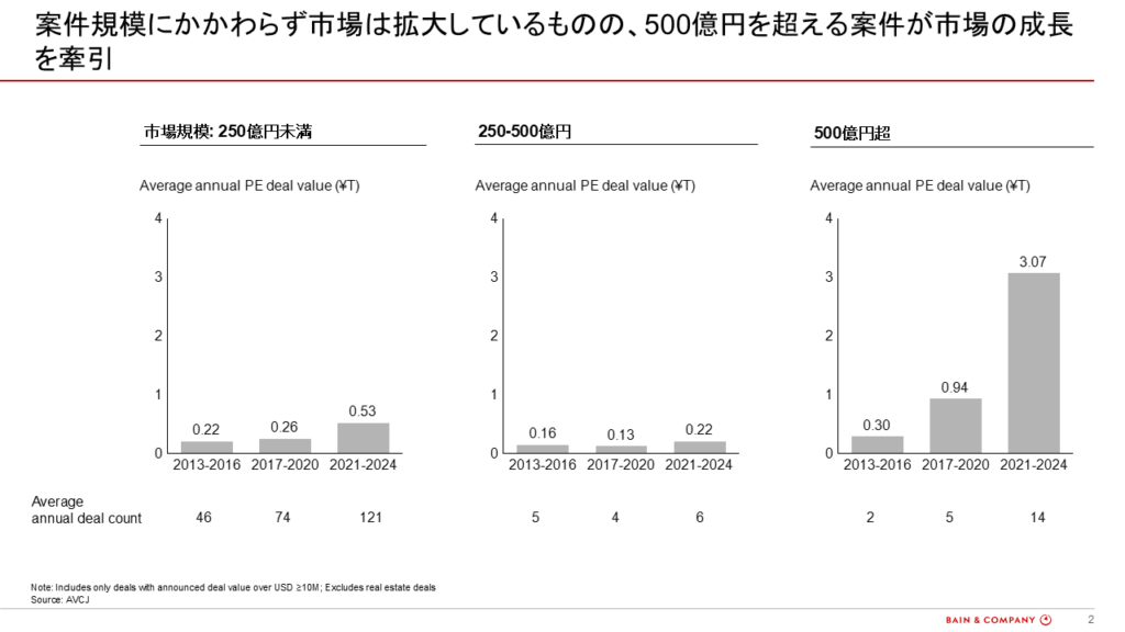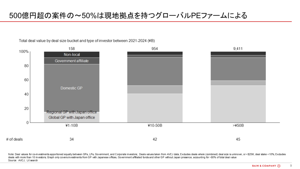 日本のPE市場における案件の大半が日本国内に拠点を置くファームによって行われている(国内PEファーム、またはアジア太平洋地域及びグローバルPEファームのいずれも含まれる)。PEファームによる案件規模は、ファンドの規模に比例している場合が多い。資金の少ない国内ファームは、アジアまたはグローバルファームより小規模な案件を実行する傾向が見受けられる。一方で、近年は国内PEファームのファンドサイズが上昇傾向にあり、より大規模な案件に参加する国内ファームも出てきている。