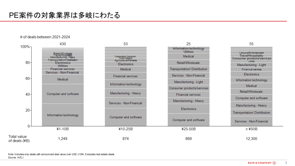 日本のPE市場においては特定の業界への目立った傾斜は見られないが、小規模案件の大部分は成長の著しい業界(ITやコンピューター/ソフトウェアなど)で実施され、大規模案件はサービス、ソフトウェア、製造関連の業界で存在感の大きさを示している。