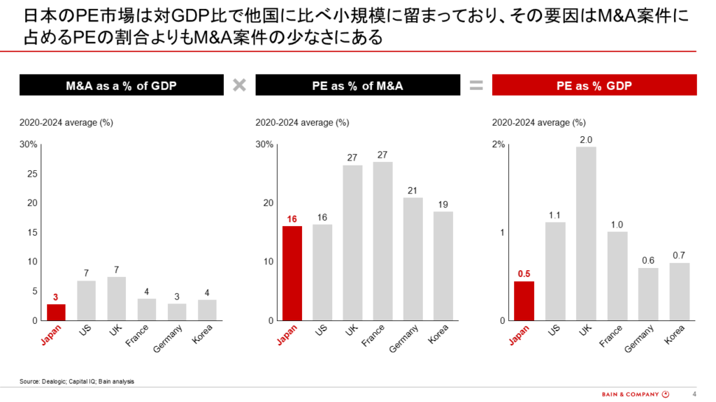PE市場をGDP比で見ると、日本は他の先進国と比べて小規模に留まっており、例えばイギリスやアメリカなどに比して2分の1から4分の1程度となっている。これは、M&A案件に占めるPEの割合が低いことも原因ではあるが、そもそも他国の市場ではより多くのM&A案件が行われていることが主な要因である。