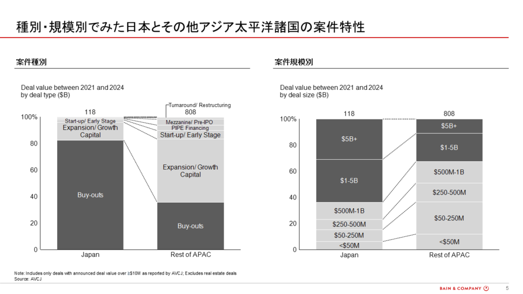 - バイアウトやその他の経営権取得を伴う取引へ傾斜:日本で実施された案件の約80%がバイアウトであるのに対し、アジア太平洋地域の他市場ではその割合は約30%