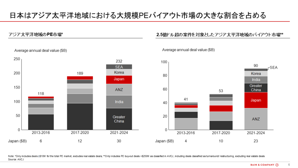 アジア太平洋地域全体のPE市場に占める日本のシェアは小さいものの、大規模なバイアウト案件(2.5億ドル超)においては、日本はアジア太平洋地域で2番目に大きな市場である。