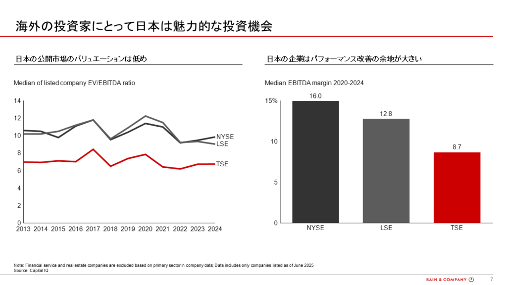 日本のPE市場は、近年の成長実績や今後のさらなる成長余地に加え、日本企業の収益性は比較的低く(改善機会を示唆)、公開市場でのバリュエーションも低いことから(妥当な価格で買収できる機会)、海外の投資家にとって魅力的な市場となっている。