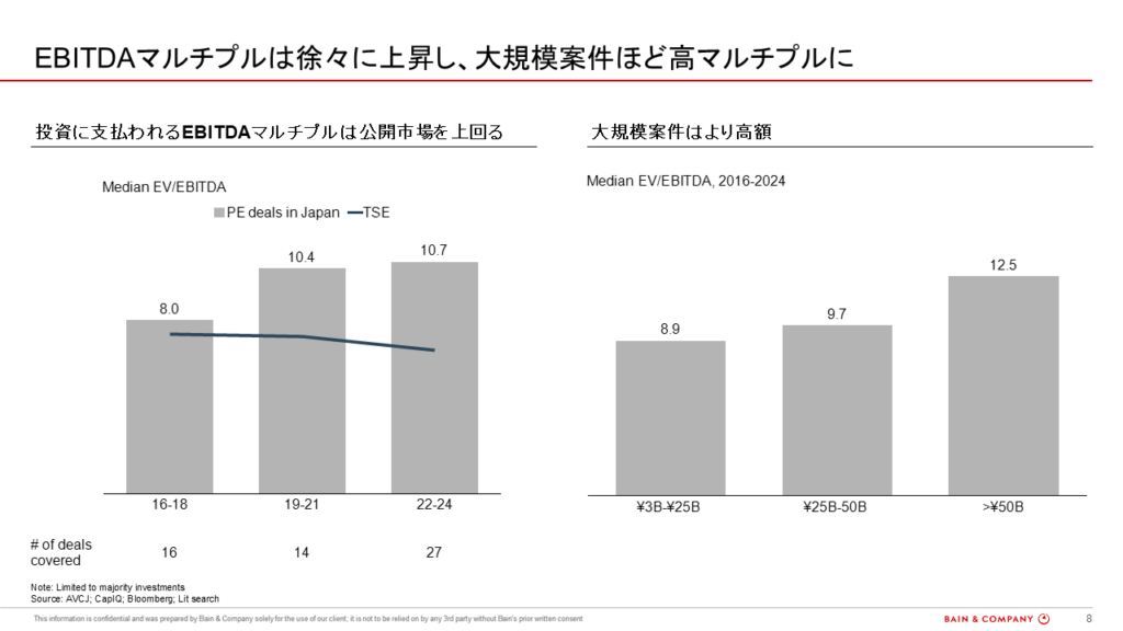 しかしながら、日本におけるPE投資のエントリー時のバリュエーションは公開市場ほど低くなく、公開市場のEBITDAマルチプルを大きく上回っている。PEファームは、事業や戦略の変革を通じて投資先企業の価値向上を見込んでいるため、そのような高額のバリュエーションを支払うことが可能である。大規模案件に支払われるマルチプルはより高いことが多く、対象会社が優良企業であることのみならず、大規模案件で典型的に行われる競争的競売プロセスを反映していると考えられる。
